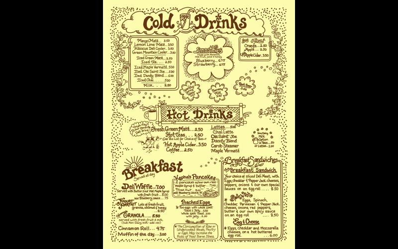 One unique feature of this Yellow Deli is we serve pancakes and maple syrup. This is because we have a sugarbush in Norton, and in the back of the Deli is a maple-syrup bottling facility.