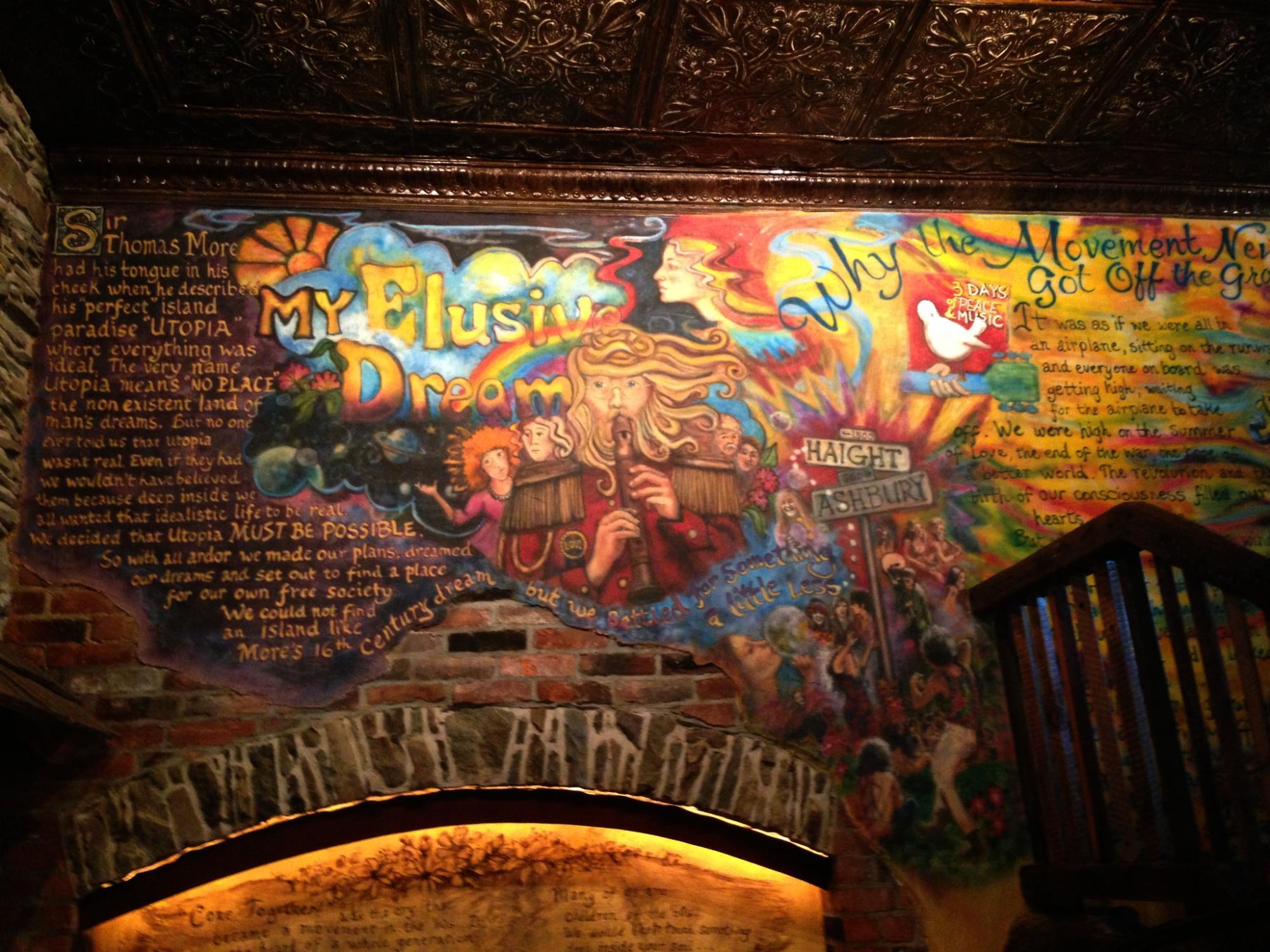 Folks love to warm themselves by either of our fireplaces and watch our dumb waiter ride up and down bringing them their scrumptious sandwiches. They are discovering the irresistible sourdough artisan breads that our lovely bakers created that day. We also have open forum Rap Sessions every Tuesday night at 7 p.m. that we would love for you to come and join us. Walk around and enjoy murals on the brick or barn wood walls painting tales of birds of every feather flocking together in one tree, or reviving the mystery of what happened to the Movements of the ’60s and ’70s.
