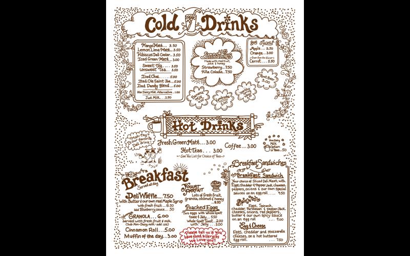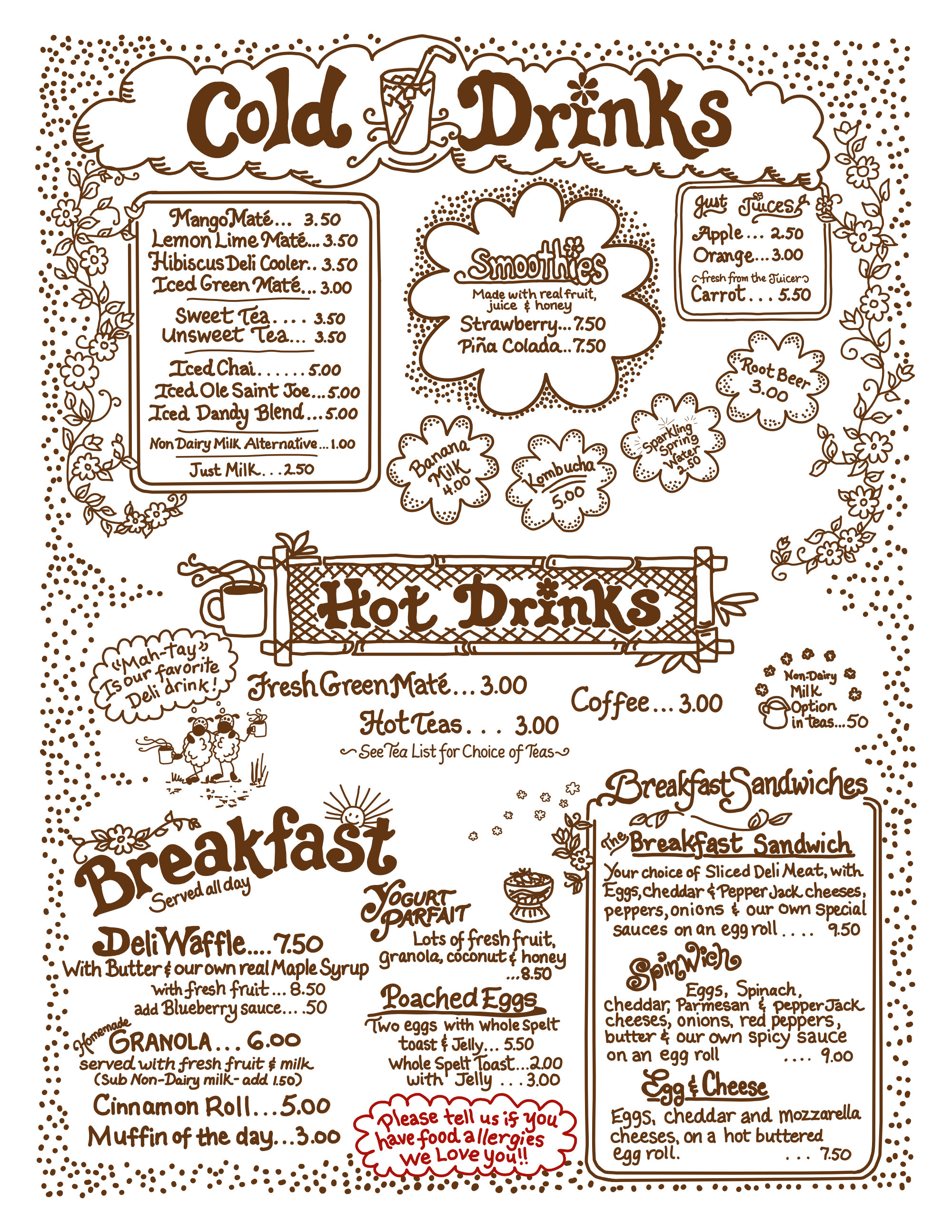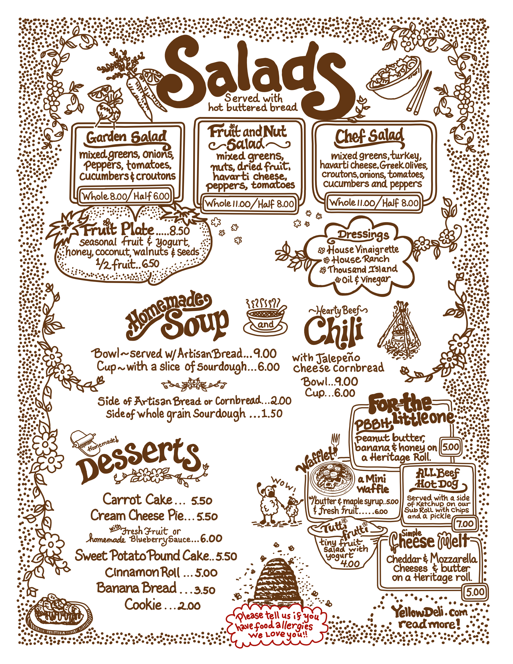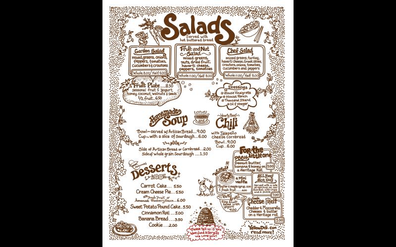 We have good, wholesome food, homey craftsmanship, and a nice environment to eat a meal... that is The Yellow Deli! Fresh baked goods are our specialty.
